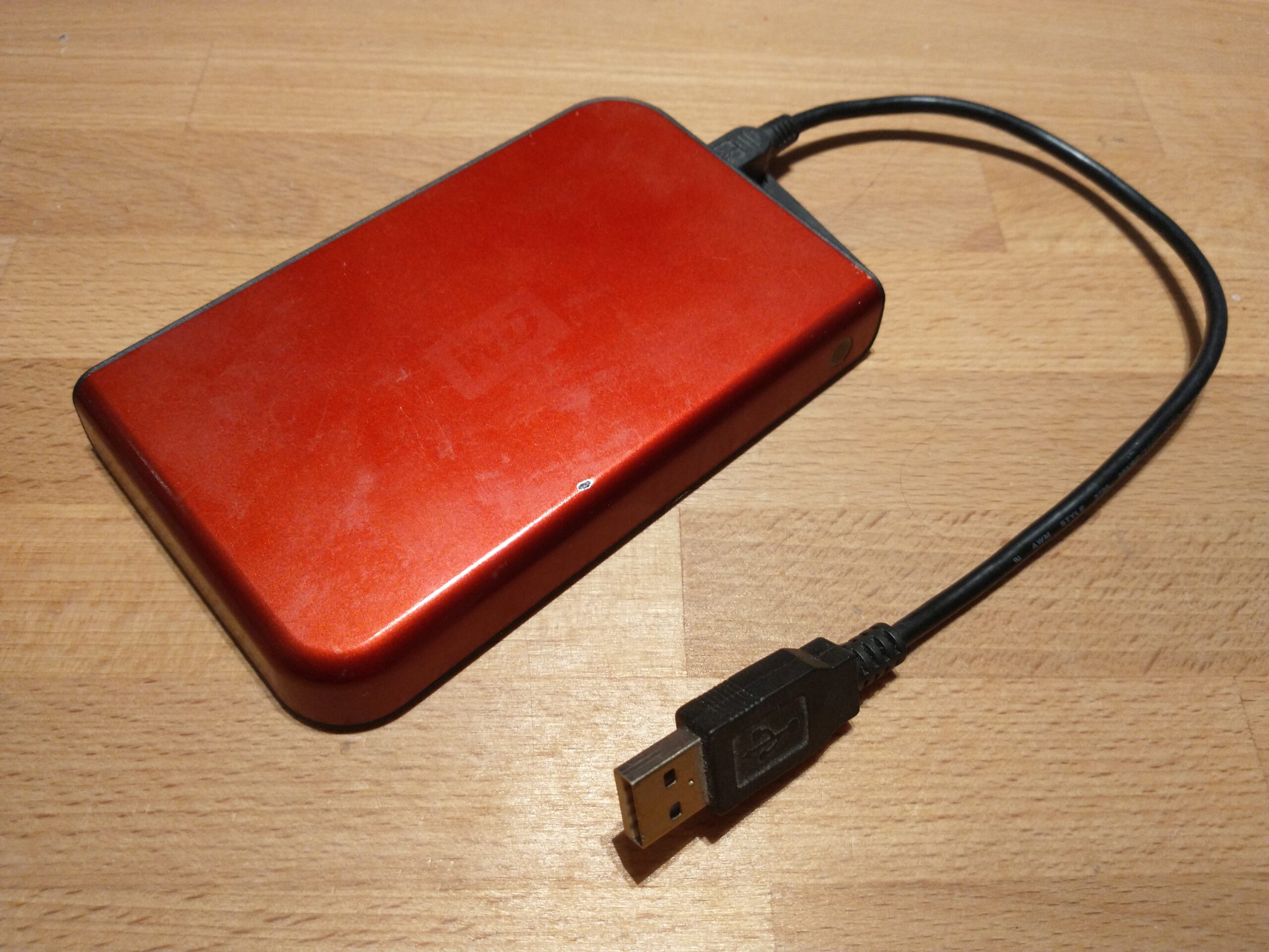 160 GB rotierende Festplatte (HDD) von Western Digital in rotem Plastikgehäuse. Verbindung über USB A (USB 2.0).